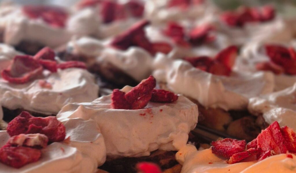 Eine zarte Zimtschnecke, gefüllt mit einer Schokocreme, die herrlich zart schmilzt. Getoppt mit einer luftig-leichten Sahnehaube und verfeinert mit aromatischen, luftgetrockneten Erdbeeren, die dem Ganzen eine fruchtige Note verleihen.